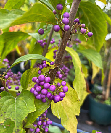 This delightful plant has mid-green, oval leaves and slender, arching stems along which blooms clusters of white/purple flower in late Spring/early Summer. These are followed by shiny, purple fruits that often persist into winter. Approx 1.2-2m (4-7ft). Well-drained soil and full/partial sun.