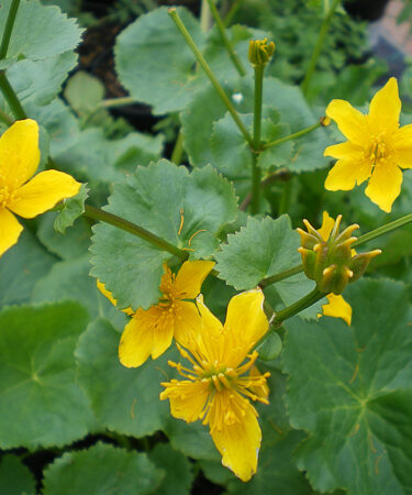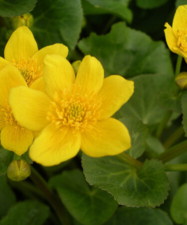 Deciduous, perennial, marginal water plant rounded, dark green leaves. Clusters of cup-shaped, bright golden-yellow flws, Apr-May. Ht 2ft. Full sun.