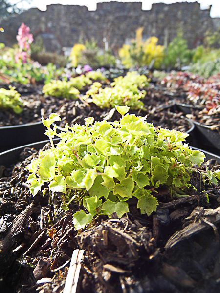 Compact cushions of bright golden foliage. Wide china blue flowers May/ Jul. Ht 4″. Well drained soil part shade.