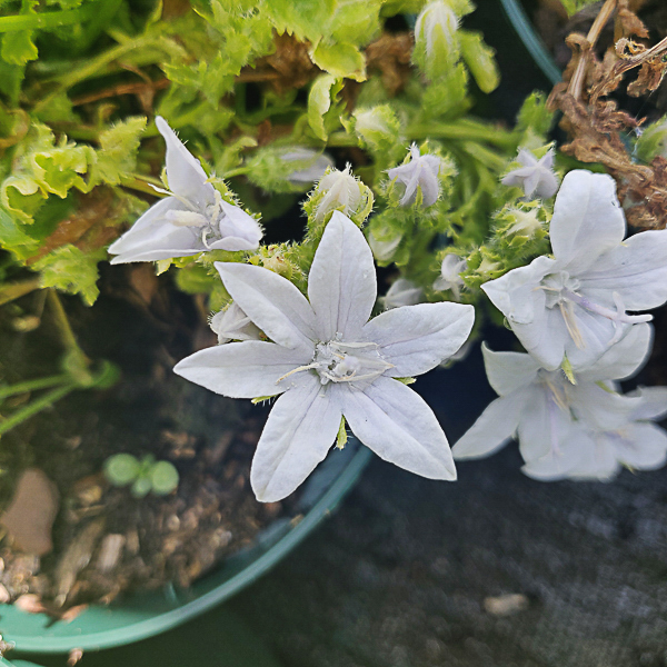Low cushions of light yellow-green toothed foliage. Panicles of large star shaped, palest lavender blue flowers, almost white, Jun/Sept. Ht 6″. Well drained sun,part shade.