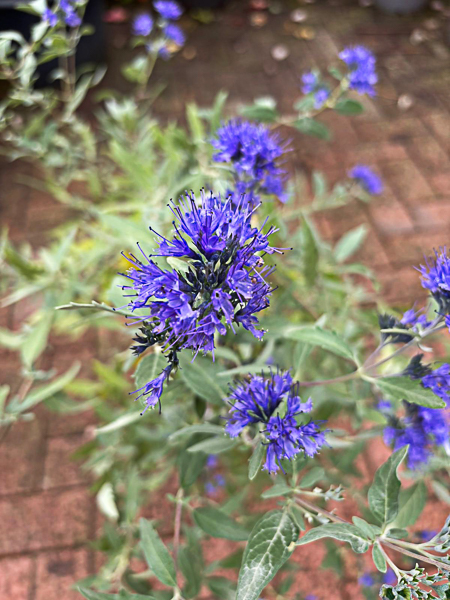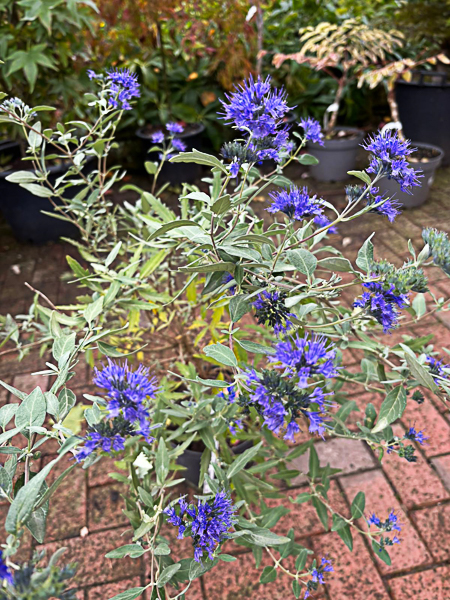 Small, showy, late flowering shrub. Forms neat rounded bush. Aromatic grey green foliage. Spikes of rich violet-blue flws, Aug-Sept. Ht 3ft. Spr 3ft. Sunny, well-drained site.