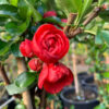 A new strain with compact, bushy habit. Approx. 1.5 m high and wide, thornfree; leaves oval, shiny dark green. Large, frilly double orange flowers; abundant blooming, March-April with reblooming in June. A very versatile shrub. Any reasonable soil. Sun or part shade. Does not fruit.