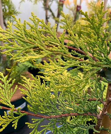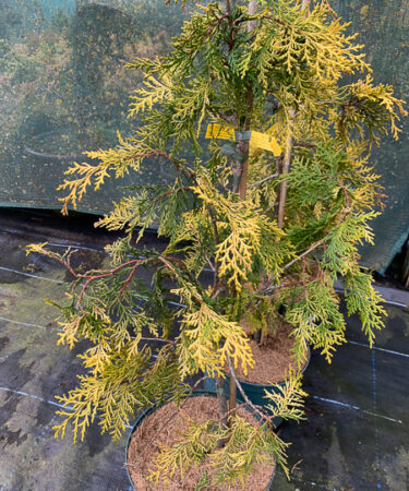 ‘Filip’s Golden Falls’ has open and ventilated branches with bracts of green strongly tinged with golden yellow. It is a conifer with a lot of character. Ht 3m.