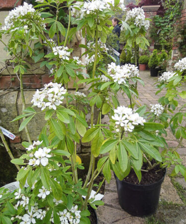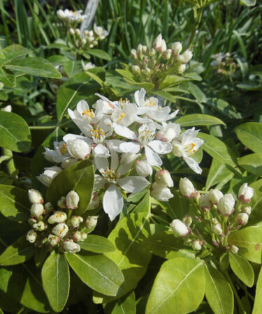 ‘Mexican Orange Blossom’. An evergreen shrub. Bright green glossy rounded fingered foliage. Clusters of highly fragrant white flowers. Flws: May-Jul. Ht 4-5ft. Well drained soil, sun.