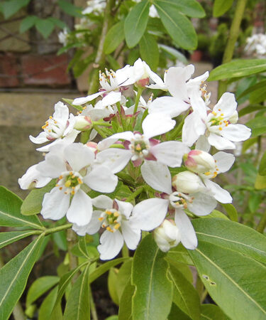 ‘Mexican Orange Blossom’. An evergreen shrub. Bright green glossy rounded fingered foliage. Clusters of highly fragrant white flowers. Flws: May-Jul. Ht 4-5ft. Well drained soil, sun.