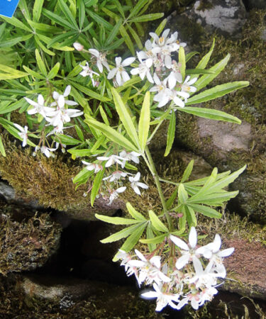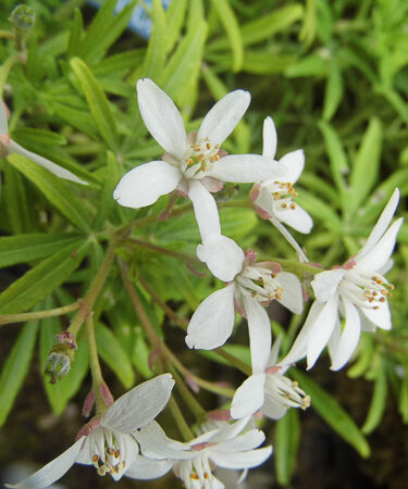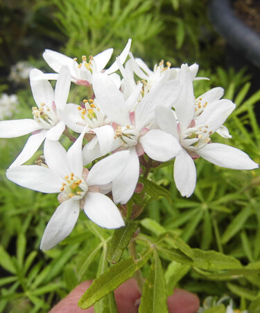 A new hybrid. Dense, compact, evergreen shrub with finely divided, pungent foliage. A profusion of flowers are pinkish in bud, opening white, appearing in May and again in late summer. Will thrive in fertile, well drained moist soil. Sheltered position. Ht: and spr 1.5m.