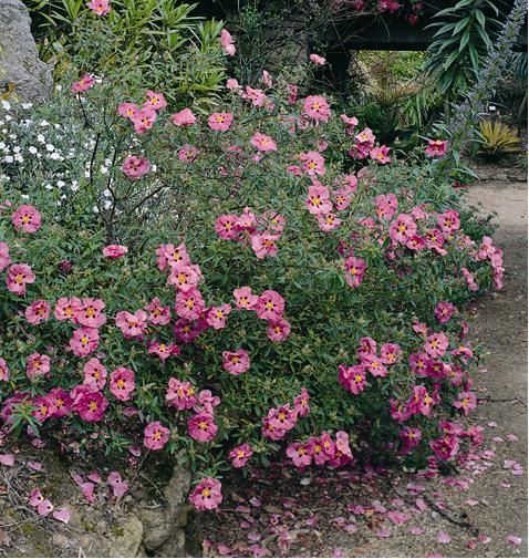 Bushy rounded evergreen shrub. Large attractive rosy crimson flowers. Central chocolate basal blotch. Flws: May-Jul. Evergreen grey green, scented foliage. Ht 4-5ft. Any well drained soil, full sun.
