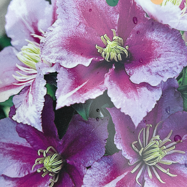 Deciduous climber. Lavender pink flowers with a purple bar. Flowers early summer and repeats late summer/ autumn. Prune code 2. Compact variety. Ht 6ft.