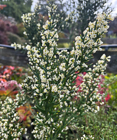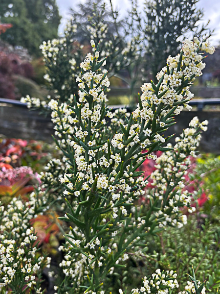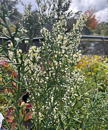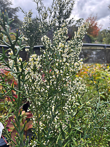 An unusual, slow growing shrub. Almost leafless, but with prominent spines. Attractive, small, pitcher-shaped white flws. Flws, Aug-Oct. Scented. Well drained soil. Sunny position.