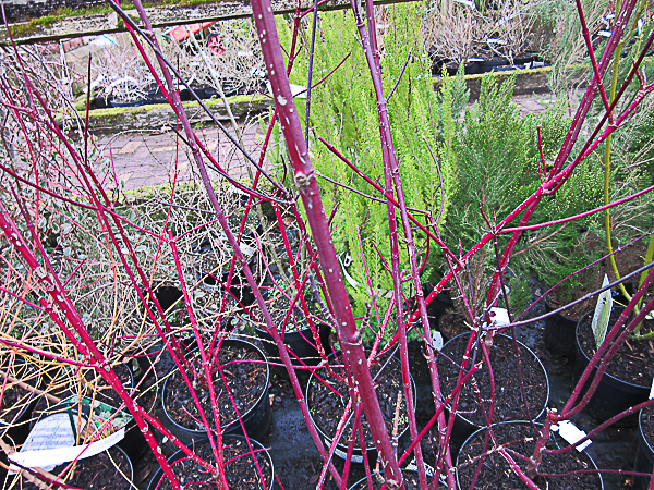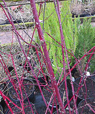 ‘Dogwood’. Stiking deep purple/ black stems. Dark green leaves. Good autumn colour. Creamy white flws, Apr-May. White fruits. Ht 5-8ft. Prune in winter. Any reasonable soil – wet/ dry. Sun or part shade.