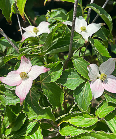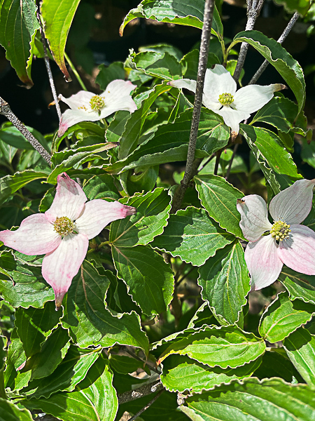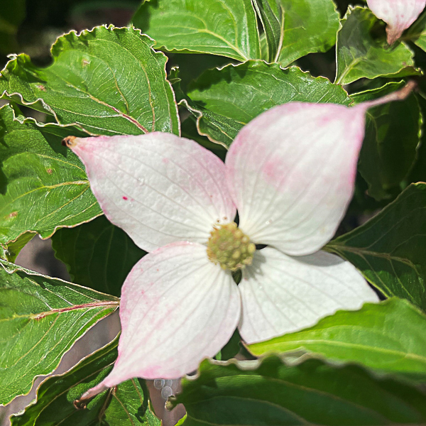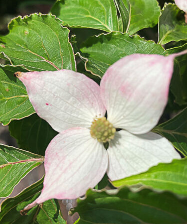 A small deciduous tree, as wide as high. Green leaves turning red or purple/red in autumn and holds the colour well. White bracts ageing to pink, June. Flws early for the group and long lasting. Raspberry red fruits, Aug-Oct. Sun or part shade. Moist, well drained, acidic soil.