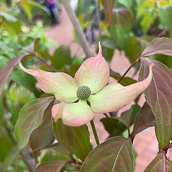 A recent selection with with leaves which emerge green in colour and turning bronze to purple red in strong sunlight. Masses of eye-catching white flower bracts in early summer, followed by small, colourful red/orange fruit later in the year. Best suited for a position in full sun. Flowering depends on the previous summers weather. Flws well following a long hot summer. Ht 4-5m.