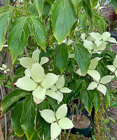 Dark glossy green with yellowish veins. White bracts becoming pink blotched with age. Well drained, humus rich soil, sun or light shade. Shelter from cold winds.
