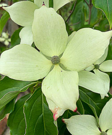 Dark glossy green with yellowish veins. White bracts becoming pink blotched with age. Well drained, humus rich soil, sun or light shade. Shelter from cold winds.