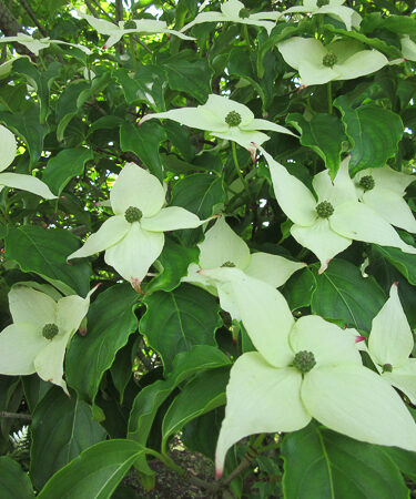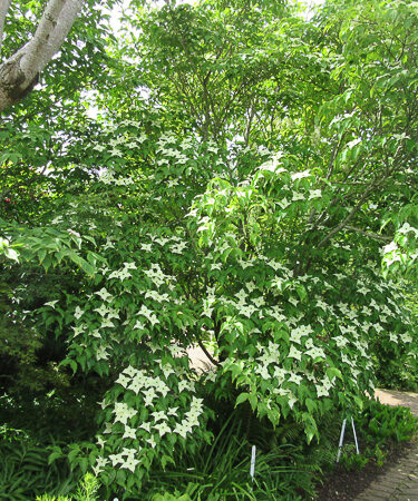 A choice chinese dogwood forming an elegant shrub. Grey green foliage. Large showy flowerlike bracts cover shrub. Flws produced on young plants. Flws: May-Jun. Ht 8m. Autumn colour. Fertile humus rich soil, sun or part shade.