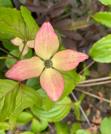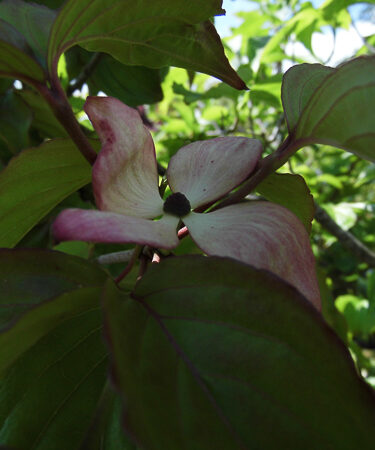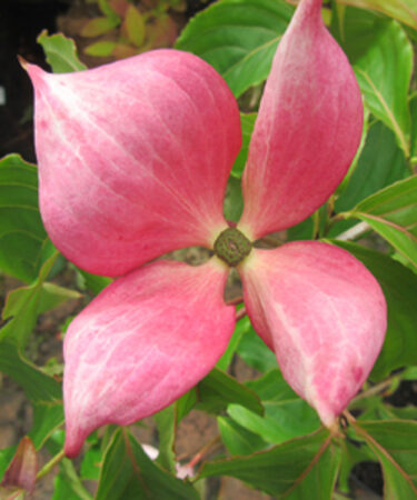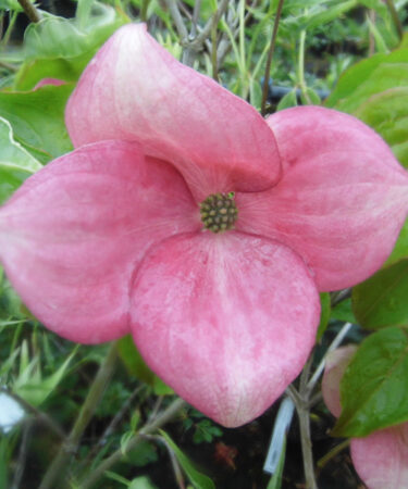 A striking new introduction from Japan. Large elegant shrub. Numerous showy deep pink bract-like flws. Flws June. Strawberry-like fruits. Ht 6-8ft. AGM. Good autumn colour, deep purple-red. Deep, fertile soil.