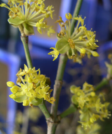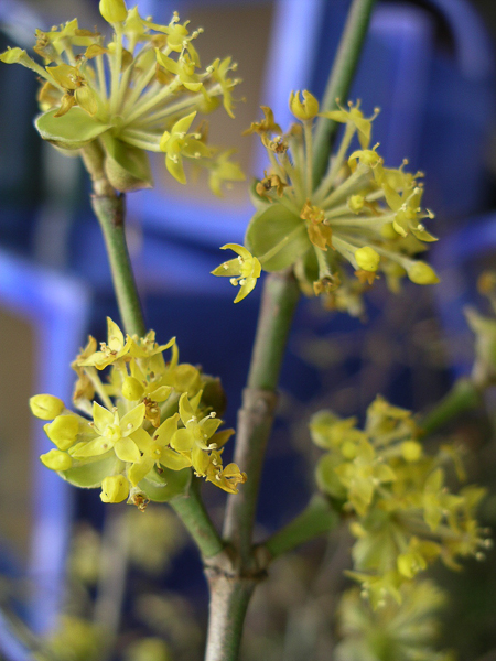 ‘Cornelian Cherry’. An elegant spreading distinctive shrub. Oval grey green foliage turning a rich magenta red in autumn. Masses of tiny yellow flws on the bare wood Dec/Mar. Edible bright red cherry-like fruit. Ht 10ft. Fertile soil, sun/shade.