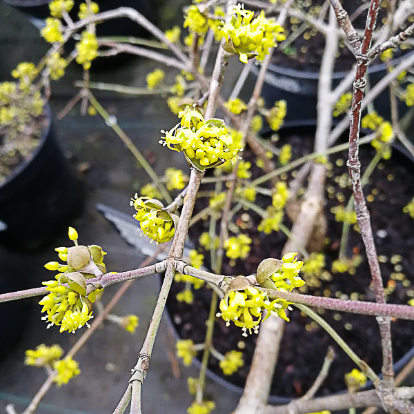 Deciduous. Erect habit with yellow leaves. Yellow flws, Apr followed by red fruits. Good red autumn colour.