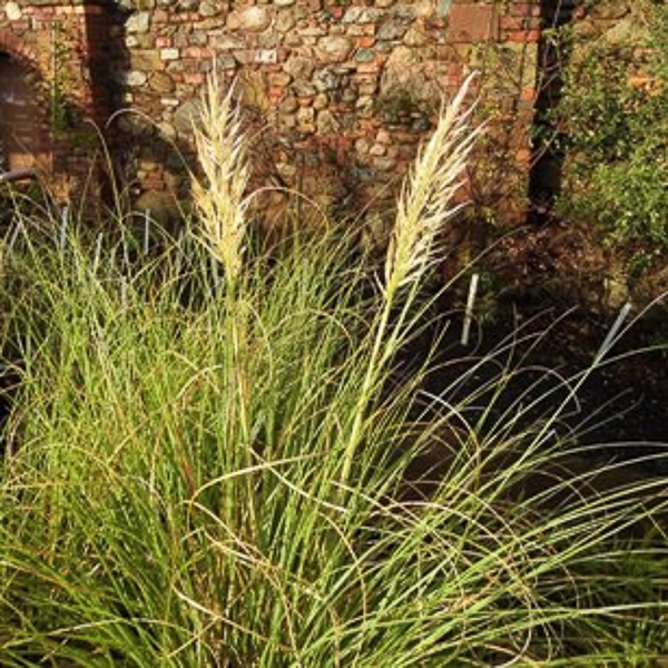 ‘Pampas Grass’. Dense clumps of narrow blue green arching foliage. Large showy silver panicles flws last through winter. Ht 4ft. AGM. Well drained soil, sun.