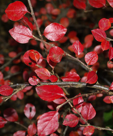 Charming shrub with a dense habit, forming hummock-like mounds. Pretty little red flowers bloom in April-May followed by the striking orange-red fruit in September. Foliage turns a beautiful coppery-purple in the Autumn. Ht; 0.7m. Prefers well drained soil & a sunny spot. Wind-hardy and good in coastal areas. Deciduous.