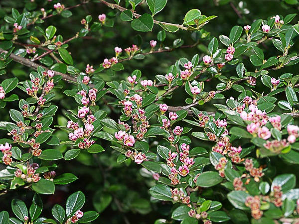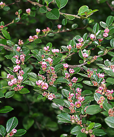 Vigorous shrub with very glossy dark green foliage and pink flowers which bloom in June. Deciduous or semi-evergreen. The rich red berries ripen November. Ht; 1-1.5m. Prefers well drained soil & a sunny spot. Wind-hardy and good in coastal areas.