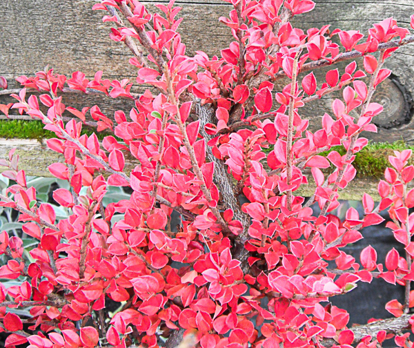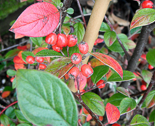 Evergreen arching shrub. Fully hardy. Oval, grey-green leaves are white beneath. Pink tinged white flowers in early summer, then a profusion of oblong bright orange fruits. Ht 8ft. Well drained soil, sun.