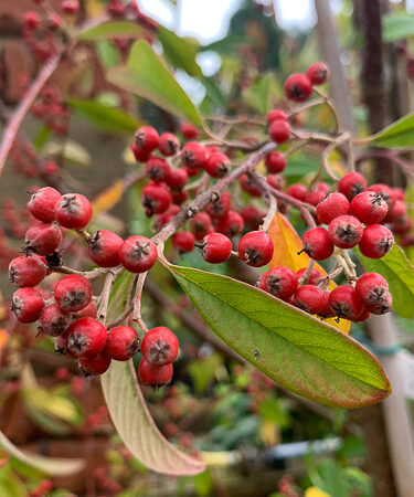 Vigorous, semi-evergreen, arching shrub. Clusters of white flowers, May, dark green foliage, large pendant clusters of decorative, bright red fruits Aug/Sept. Full sun and well drained soil. Ht 12ft.