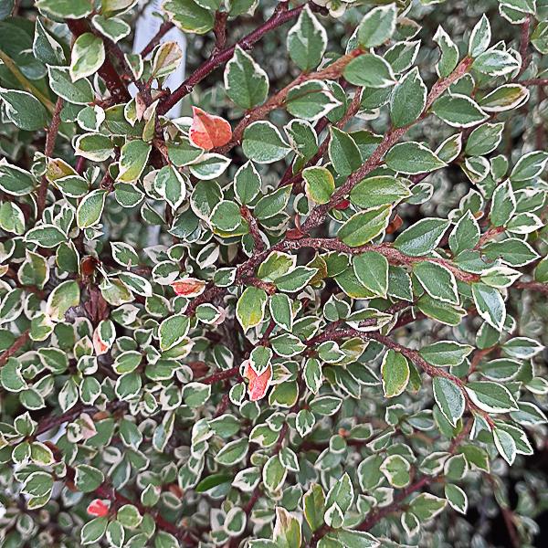 Low growing shrub of spreading habit. Small variegated cream/green foliage. Foliage suffused with red in autumn. Pink tinged white flws. Flws: Jun-Jul. Attracts bees. Red berries. Ht 2ft Spr 6ft. Can be grown against a wall. Any reasonable soil or aspect. Deciduous.