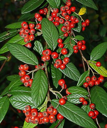 Dark green leaves on gracefully arched branches, pink flowers bloom in July.Evergreen. Long lasting bright rusty red fruit is ripe from Nov – Dec. Ht; 2-3m. Prefers well drained soil & a sunny spot. Wind-hardy and good in coastal areas.