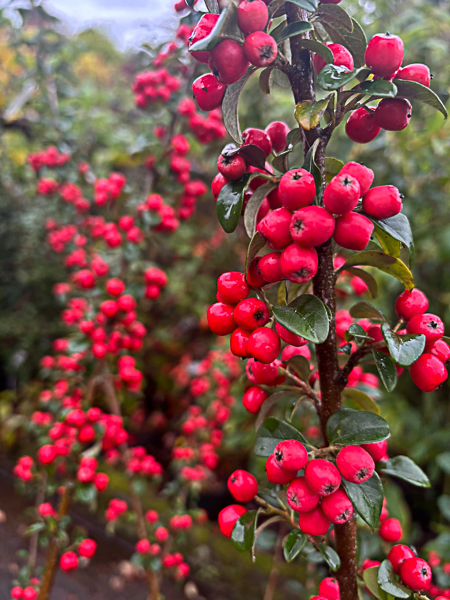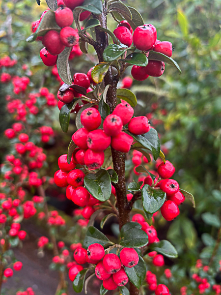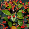 Narrowly erect habit with larger, dark green leaves and white flowers which bloom in May/June. Evergreen or semi-evergreen. Succulent ruby-red fruit from Oct-Nov. Ht; 1-1.5m. Prefers well drained soil & a sunny spot. Wind-hardy and good in coastal areas.