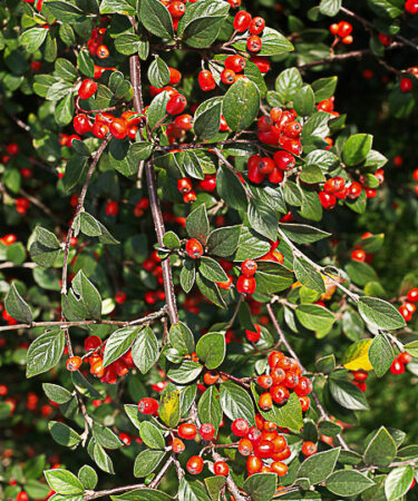 Outstanding shrub with shiny, mid-green foliage and multitudes of red flowers. The striking orange-red fruit is ripe from Oct-Nov. Ht; 1.5-2.5m. Prefers well drained soil & a sunny spot. Wind-hardy and good in coastal areas. Evergreen.