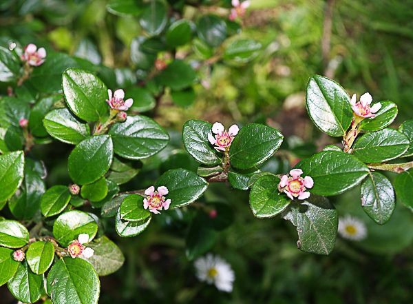 Good all-rounder shrub with a creeping/climbing habit, attractive dark green leaves and very pretty pink flowers in June. The large, light yellow/orange fruit is ripe in November. Ht; to 0.5m. Prefers well drained soil & a sunny spot. Wind-hardy and good in coastal areas. Evergreen sheltered / Semi evergreen colder areas