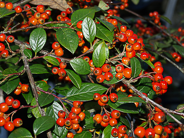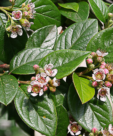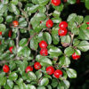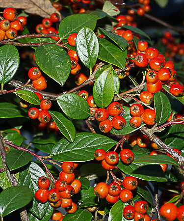 Very shiny, mid-green foliage on horizontally growing branches which also bear pink flowers from June – July. Evergreen. Orange to light red fruit is ripe from Oct – Dec. Ht; to 1.5 m. Prefers well drained soil & a sunny spot. Wind-hardy and good in coastal areas.