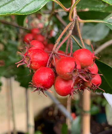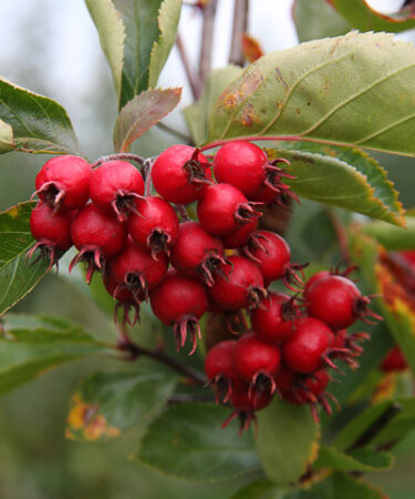 Exceptional large red fruiting form developed in the Netherlands. A fast growing hawthorn with strong stem. Very floriferous and abundant fruit. It has a very full crown with strong lower branches. It is very suitable as a garden or park solitary or avenue tree. Most important is that this Crataegue is fire blight resistant! Ht 6m in 10 years.