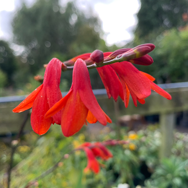 Crocosmia Lady Ann. Dark orange-red flowers. Height 75-100 cm. Produces decorative clumps of bright inflorescence and long erect leaves. It’s a cormous perennial that will multiply and come back year after year. Plant in spring after frost, full sun to part shade in well drain soil enrich with compost. Water thoroughly once and keep some mulch over it to keep in the moisture.