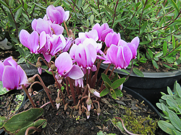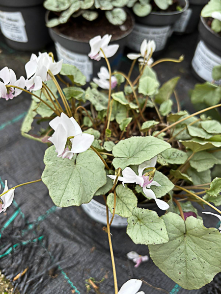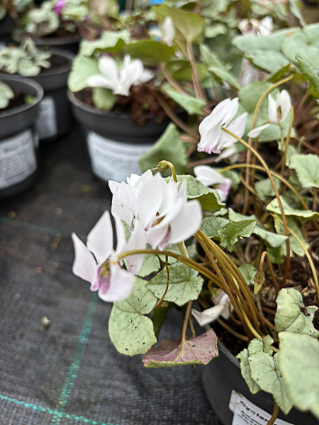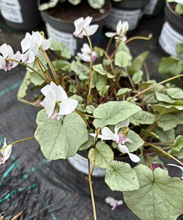 Autumn flowering tuber. Rich pink flws, stained darker at the mouth. Leaves variable, often ivy shaped with silvery markings. Ht 3″. Well drained soil, sun/ part shade.