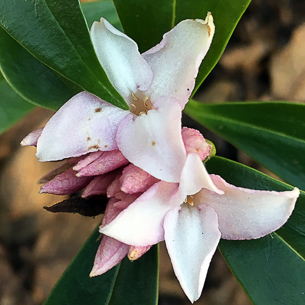 Daphne odora ‘Perfume Princess’ A showy new hybrid with larger flowers than others in the species, and their scent is divine! Flws form in clusters in the leaf axils along the length of the stems. Mainly evergreen the leaves are lustrous and dark green, so will add structure and form all throught the year. Its perfect for a partially shady border, or a woodland garden. Ht 5ft (1.5m) x 3ft (0.9m).