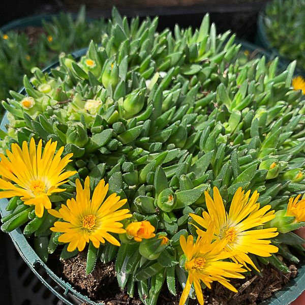 Mats of succulent sedum like foliage, deep golden yellow stemless daisy flws. during summer. Ht 1″well drained soil,sun