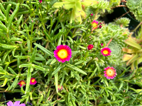 Mats of succulent sedum like foliage, large vibrant pink stemless daisy flws with yellow centres produced over a long period from spring to first frosts. Ht 15cm x spr 30cm. A great choice for hot, dry areas and excellent in the rock garden or wall and for edging the front of a border. Attractive to butterflies. Drought tolerant once established.