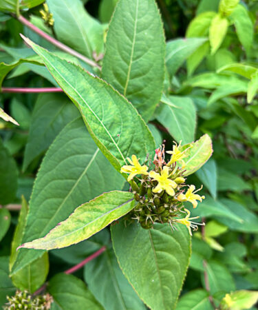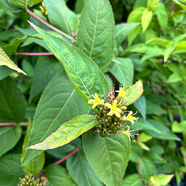 Diervilla rivularis ‘Honeybee’ is a striking, decidous shrub with bright golden leaves and masses of yellow orange flowers in summer. Attracts bees and insects! Very hardy. Height and Spread 1.2m x 1.2m. Well drained soil, sunny position.