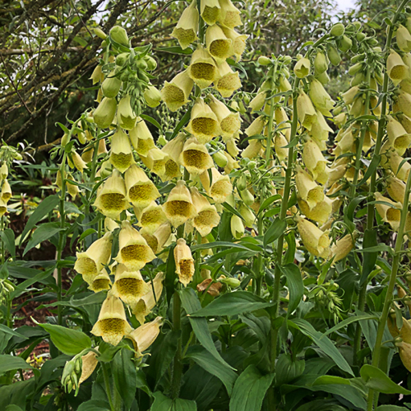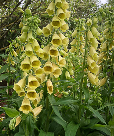 A clump forming foxglove with glossy mid-green leaves and pale yellow trumpet flowers with brown veins inside. Height 3ft. Ideal for woodland area or mixed border in part shade.