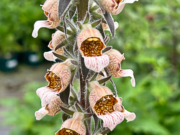 An unusual foxgloves. Tall spikes of densely packed, fawn coloured flowers each with a pearl coloured, protruding lower lip. Each of the blooms is delicately patterned with pale coffee-brown veins. It produces many dense woolly spikes, often reddish-purple in colour, and the mid-green, lance shaped leaves sometimes have white woolly hairs on the leaf veins. A reasonably perennial species. Well-worth trying in a shady, well-drained spot in the garden. Ht 60-72cm (24 to 30i