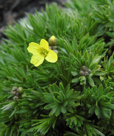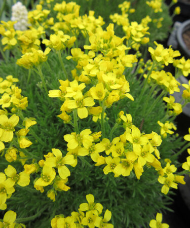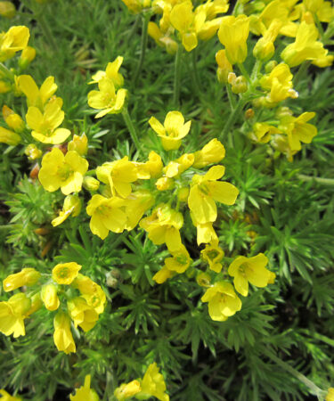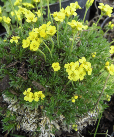 Small, tight rosettes of minutely hairy leaves and small scapes of relatively large, mid yellow flowers in Spring. Well drained, gritty soil. Part shade.