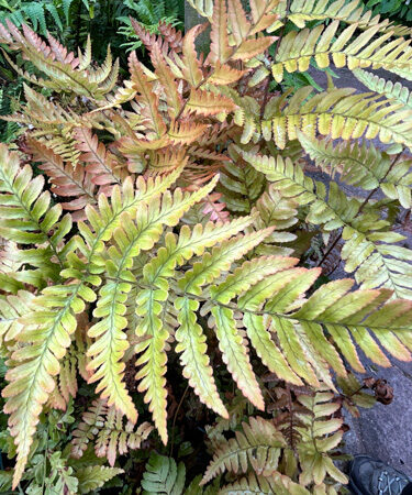 Broadly triangular fronds. A striking copper colour when young. Maturing deep green. Rare semi-evergreen. Ht 2′. Moist peaty soil, part shade.