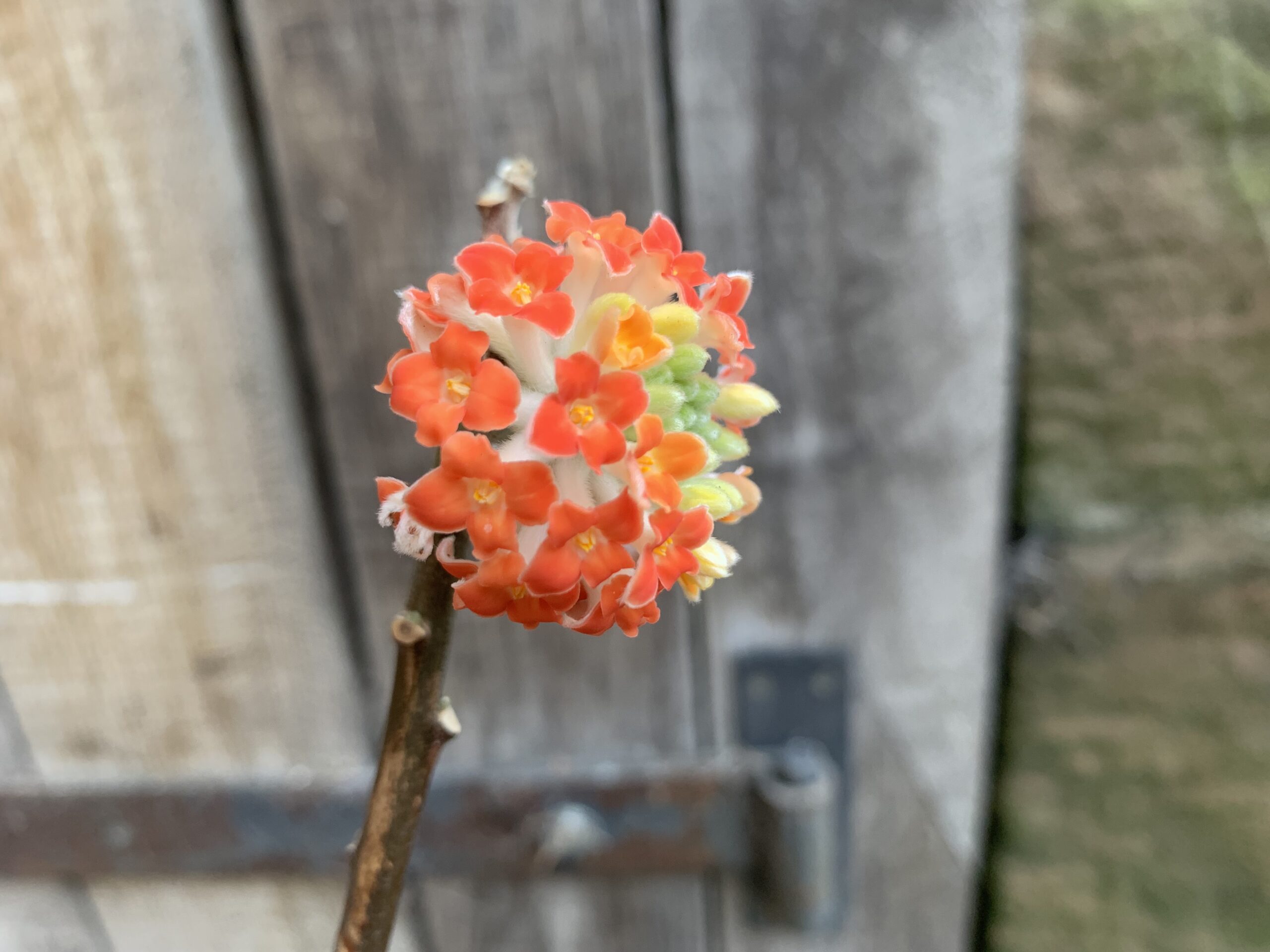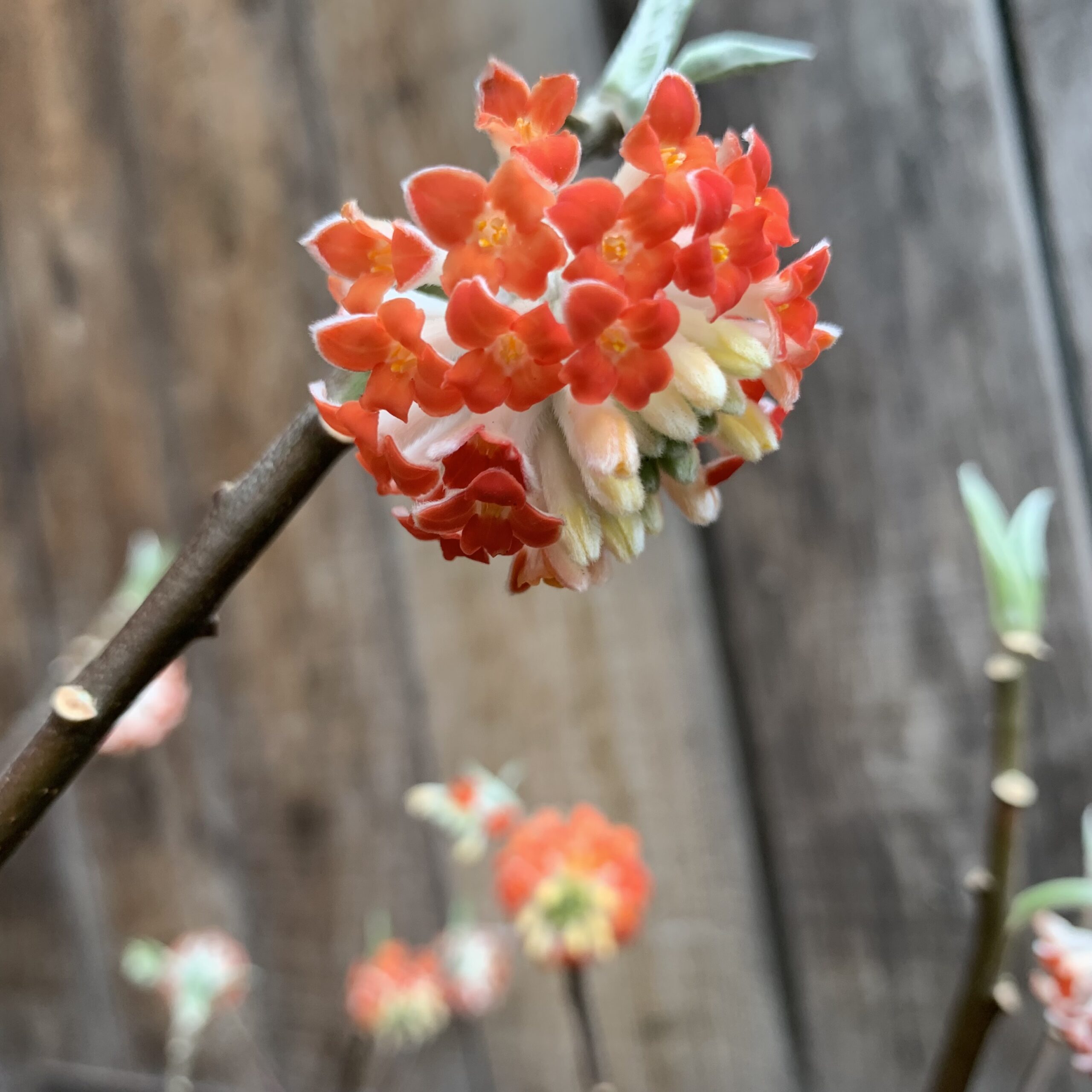 A very rare form of this chinese shrub with scarlet red flowers. Low growing. Dense nodding terminal clusters of large highly fragrant silky haired flowers, Jan-Feb on bare stems. Ht 3-4ft. Well drained fertile soil, sun.