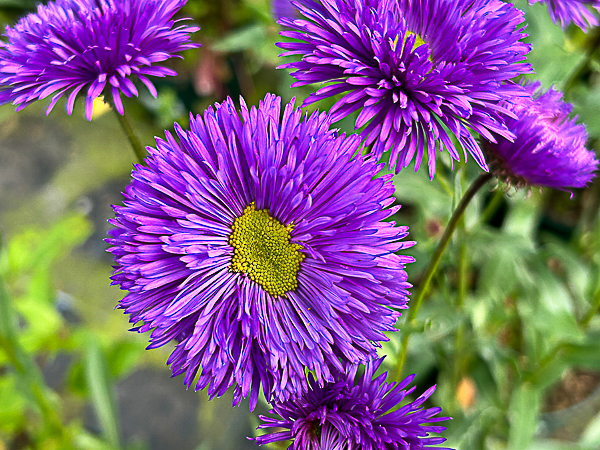 Fleabane. Very free flowering. Clumps of grey-green leaves. Daisy-like purple flws with yellow centres are produced in abundance May-Jul. Ht 2ft. Full sun and well drained soil.