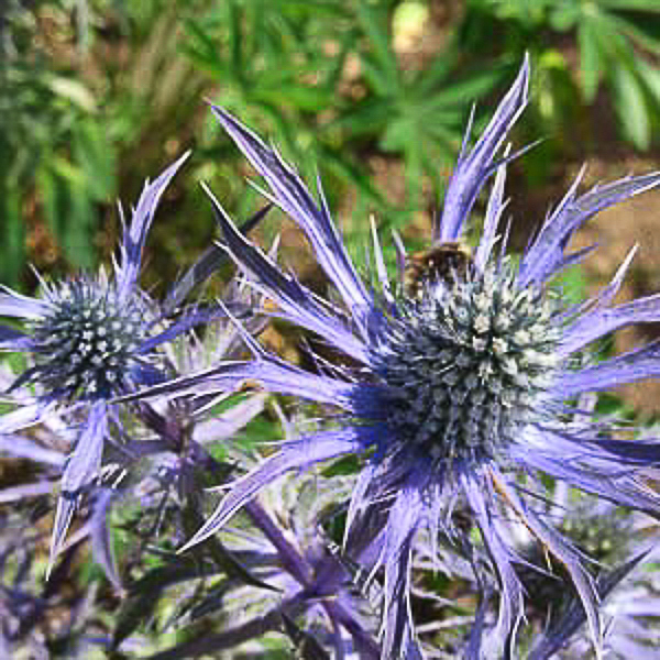 Seaholly. A striking new hybrid with blue stems, silvery leaves and iridescent blue thistle-like flowers, summer. Long flowering period. Excellent cut flower. Ht 20-30″. Well drained soil. Sunny position.