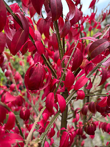 ‘Winged Spindle’. Deciduous, bushy shrub. Shoots develop corky wings. Dark green leaves, brilliant red in autumn. Inconspicuous, greenish flws. Reddish purple fruits, bright orange seeds. Ht 5ft. AGM. Slow growing. Full sun, well drained soil.