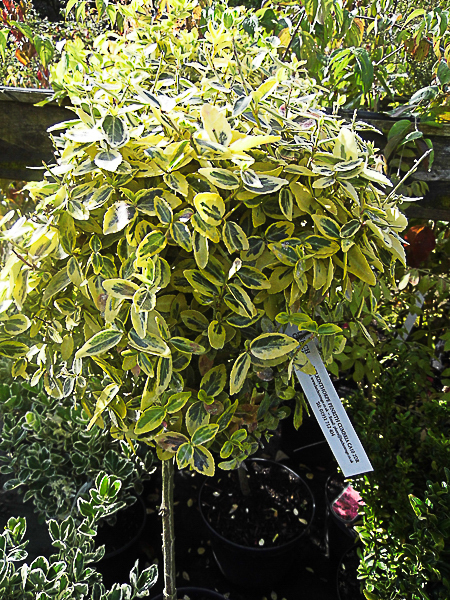 Good evergreen, dwarf bushy shrub with glossy green leaves edged, bright yellow and tinged with pink in winter. Ht 3-4ft+ Full sun, well drained soil.