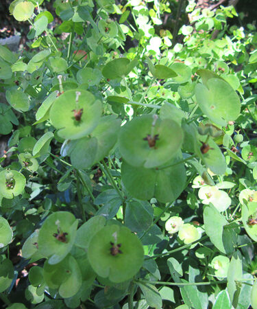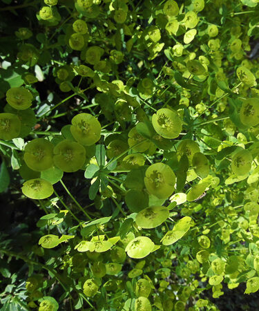 Evergreen ground covering rosettes. Open spires of flat lime-green flws. Flws: Jun-Jul. Thick, leathery leaves. Ht 18.” AGM. Sun or part shade. Moist, but well drained soil.